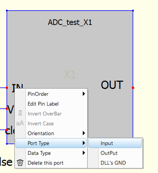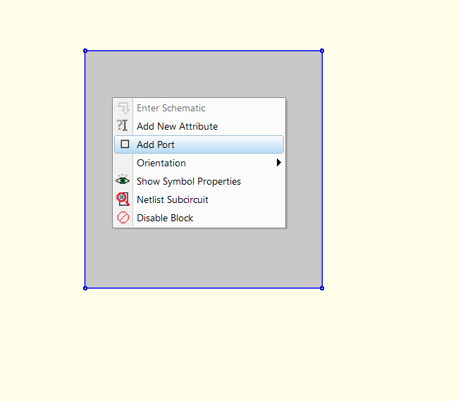 そうしたら、灰色の枠の中で、右クリックすることで下記のメニューが出てくるので、「Add port」を選択し、枠の淵の部分に端子を作成します。