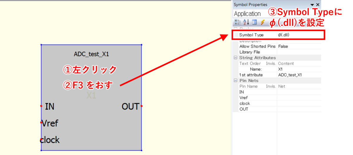 そうしたら、この素子のシンボルタイプをΦ(.dll)にしておきます。編集するにあたっては、ショートカットキー「F3」で「Symbol Property」を開くと便利です。
